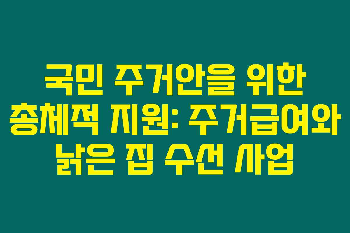 제가 직접 알아본 바로는, 대한민국 정부는 주거 안정성을 높이기 위해 다양한 지원 프로그램을 운영하고 있습니다. 그 중에서도 주거급여 지원과 낡은 집 수선 프로그램은 국민의 주거환경을 개선하는데 큰 역할을 하고 있답니다. 아래를 읽어보시면 이 프로그램들의 세부내용을 보다 더 잘 이해할 수 있을 거예요.