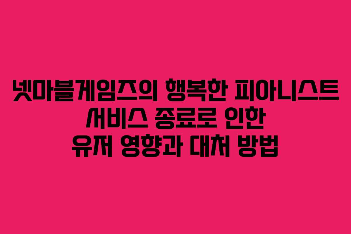 최근 넷마블게임즈에서 서비스하는 모바일 게임 중 하나인 행복한 피아니스트 for Kakao가 5월 18일부로 서비스 종료된다는 소식이 전해졌다. 이 게임은 2013년 12월 31일에 출시되어 약 1년 5개월 동안 많은 유저들에게 사랑받아왔다. 이번 종료 소식은 많은 유저들에게 아쉬움을 안기고 있으며, 이에 대한 여러 가지 고려가 필요하다.
