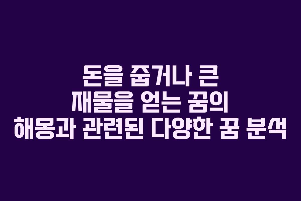 돈과 재물에 관한 꿈은 많은 이들에게 깊은 인상을 남깁니다. 꿈 속의 돈은 단순한 화폐를 넘어서, 다양한 의미와 상징을 지니고 있습니다. 이번 글에서는 돈을 줍거나 큰 재물을 얻는 꿈을 포함하여, 다양한 돈 관련 꿈에 대한 해몽을 살펴보겠습니다. 꿈의 해석을 통해 미래의 가능성을 엿보고, 나의 삶에 어떤 변화가 있을지를 생각해보는 기회를 가져보시길 바랍니다.
