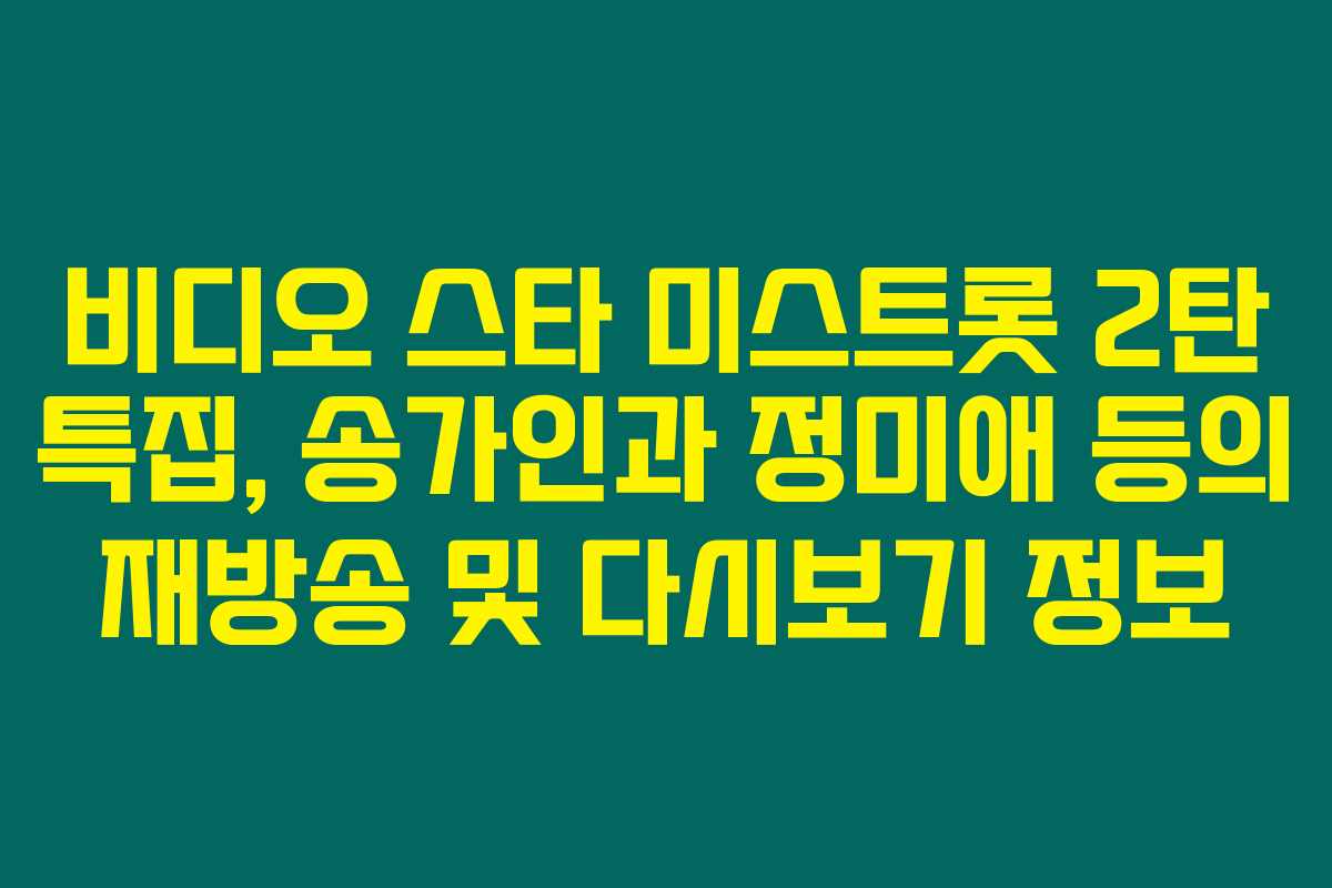 비디오 스타 미스트롯 특집 2탄이 궁금하시다면 이제 프로그램 방영 시간과 다시보기 방법을 확인해 보세요. 오늘 오후 8시 30분에 방송되며, 이 기회를 놓치지 않도록 재방송 정보도 함께 알아보겠습니다.