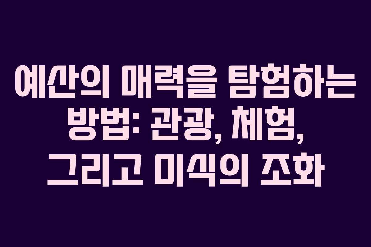 예산은 단순한 관광지를 넘어, 다양한 체험과 미식을 통해 방문객들에게 특별한 경험을 제공합니다. 이곳에서의 하루는 잊지 못할 추억으로 남을 것이며, 지역 주민들의 따뜻한 환대와 함께 더욱 풍성해질 것입니다. 예산 여행은 여러분의 삶에 소중한 경험을 더해 줄 것입니다.