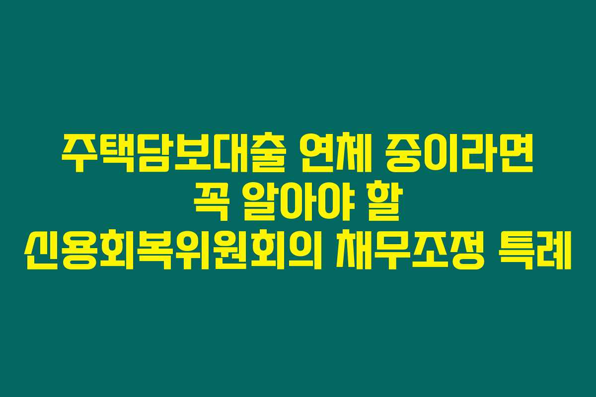 주택담보대출을 연체하고 계신가요? 이로 인해 경제적 어려움을 겪고 있다면 신용회복위원회의 채무조정 특례와 담보주택 매매지원에 대해 꼭 알아보아야 해요. 채무조정을 통해 여러분의 금융 부담을 줄이고 안정된 주거 생활을 이어갈 수 있는 방법을 확인해보세요.