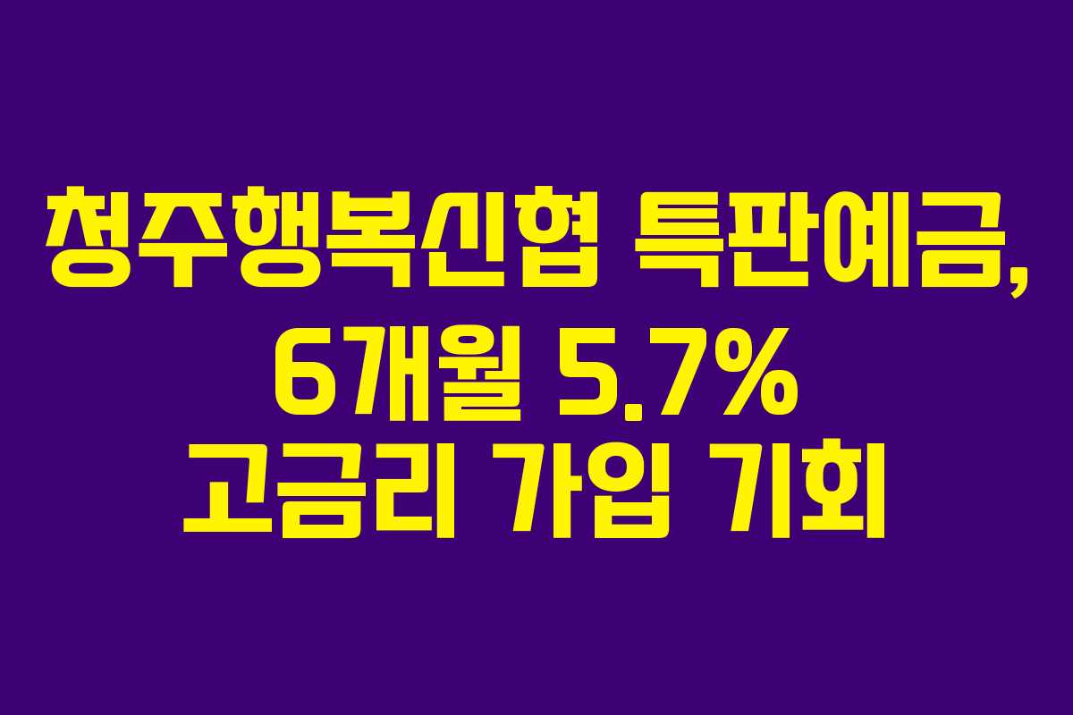 청주행복신협에서 제공하는 특판예금 상품은 6개월 동안 5.7%, 12개월 동안 5.5%의 고금리를 자랑합니다. 이번 특판은 창구 방문 가입 조건으로 선착순 100억 원 한도로 판매되며, 청주행복신협을 직접 방문해야만 가입이 가능합니다.