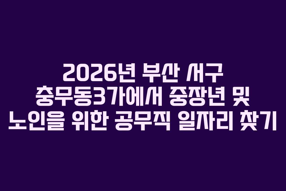 부산 서구 충무동3가에서 중장년 및 노인을 위한 공무직 일자리는 다양한 경로를 통해 접근할 수 있습니다. 2026년에는 다음과 같은 경로를 고려해볼 수 있습니다.