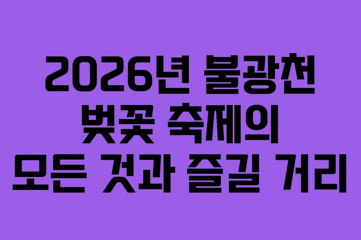 2026년 불광천 벚꽃 축제는 2026년 4월 5일(금)부터 4월 6일(토)까지 이틀 동안 진행됩니다. 축제의 주요 행사들은 낮 12시부터 시작되며, 저녁에는 대중가수들의 공연이 예정되어 있습니다. 특히, 벚꽃의 낮과 밤의 아름다움을 모두 경험할 수 있도록 저녁 시간에 맞춰 방문하는 것이 좋습니다.